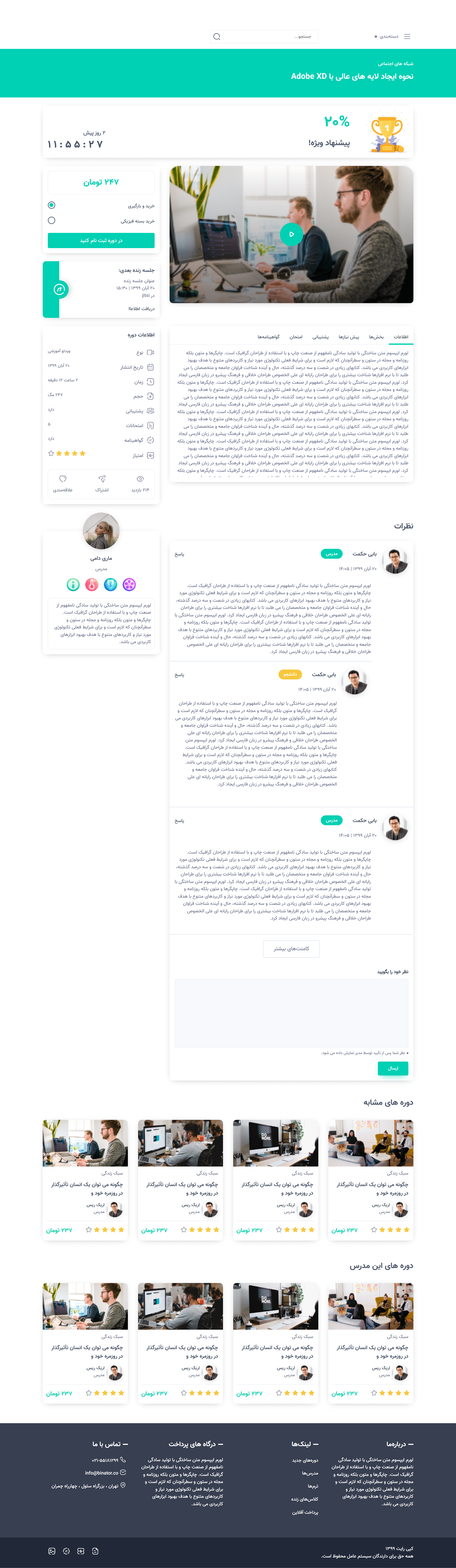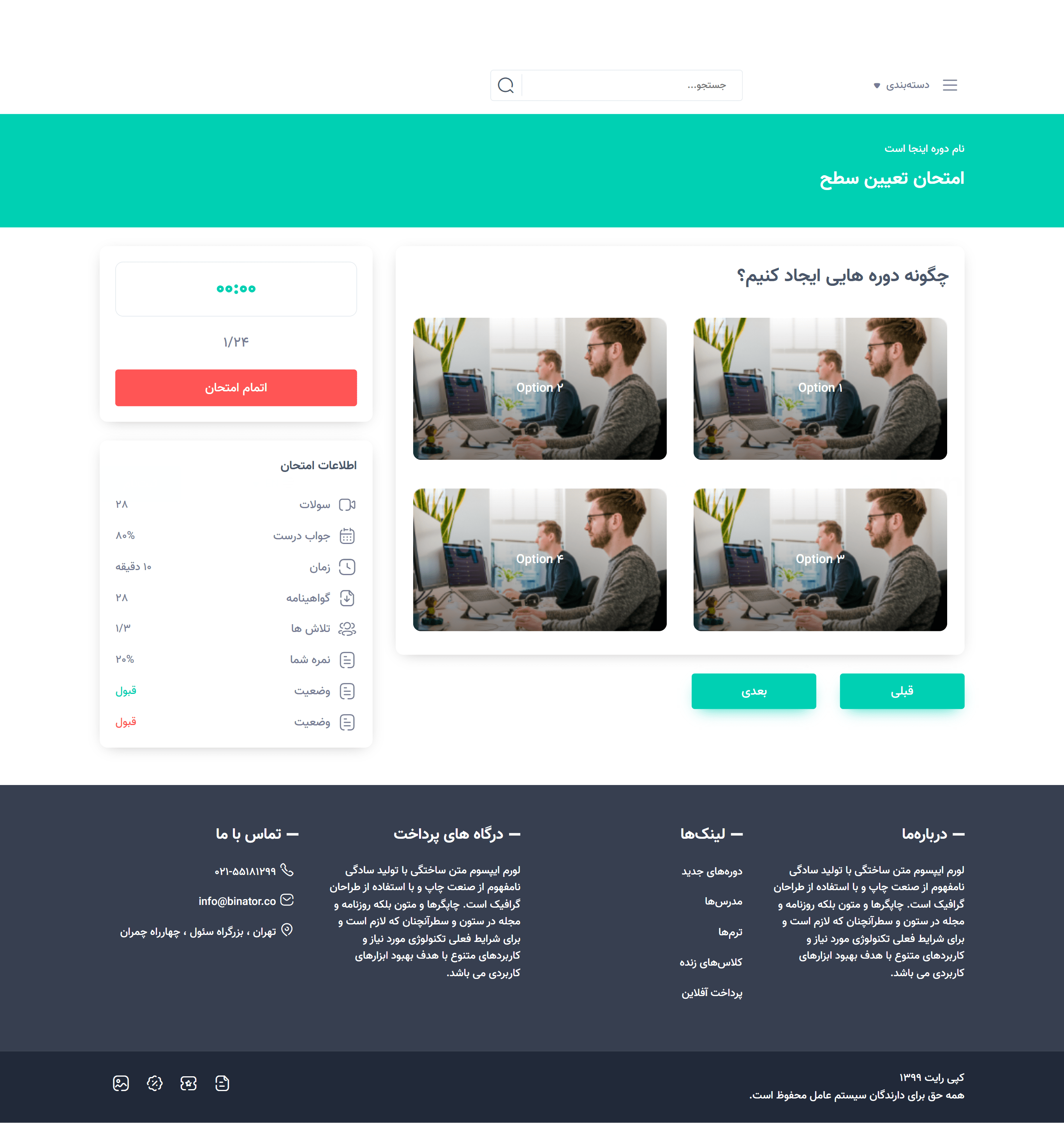 این سایت شامل ۲۷ صفحه مختلف از جمله؛ پنل کاربری، پنل مدرسین، دستهبندی دورهها، دورههای پر فروش، بلاگها، صفحه کوئیز و اعلام نتایج میباشد.